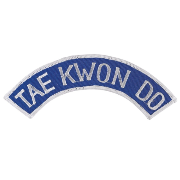 Patch ricamata con la scritta "Tae Kwon Do", dal design curvo, perfetta per essere cucita su divise, giacche, borse o zaini. Un simbolo distintivo per praticanti e appassionati di Taekwondo.
