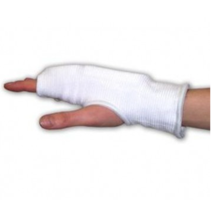 White stretch cotton gloves. They have two openings for two fingers and one thumb opening for easy grip.