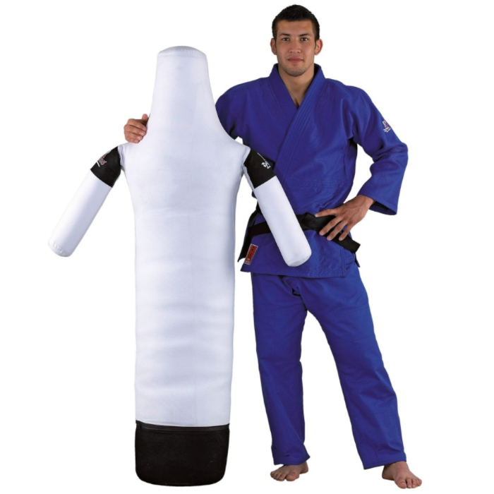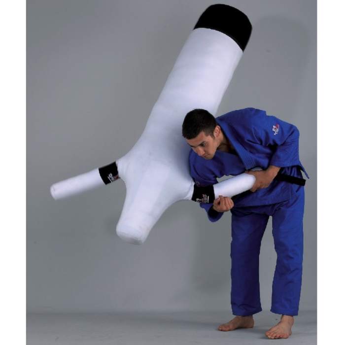 Judo training mannequin made of sturdy high quality white canvas fabric with heavy material inner padding. Imitation leather inserts with embroidered logo on the upper part of the arms. Great training product for judo, wrestling, grappling (throws, holds, etc.).