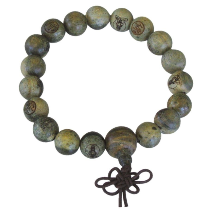 Original bracelet directly from Shaolin, worn by monks and students. These bracelets are used as a tool for prayer and meditation, good luck charm and blessing; they are the most common accessory for all Shaolin practitioners. Each wooden bead is engraved and lightly scented and the bracelet features an endless knot.
