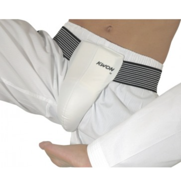 Wide elasticated band that supports anatomical protection. Hard plastic cup, covered with vinyl. adjustable laces behind. harmful substances tested.