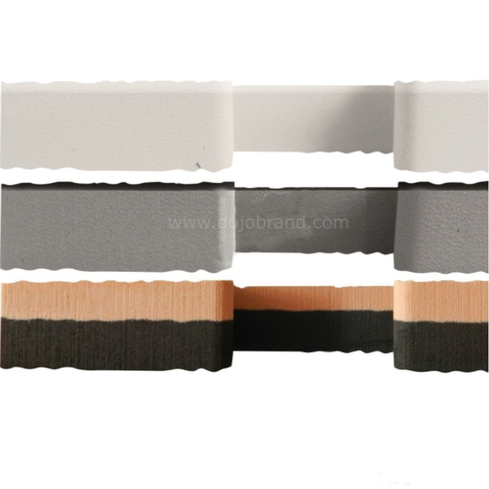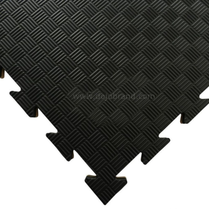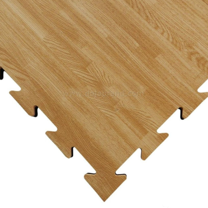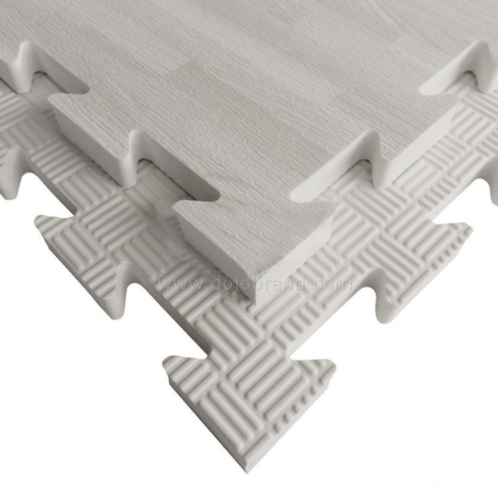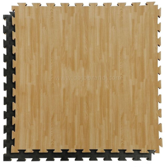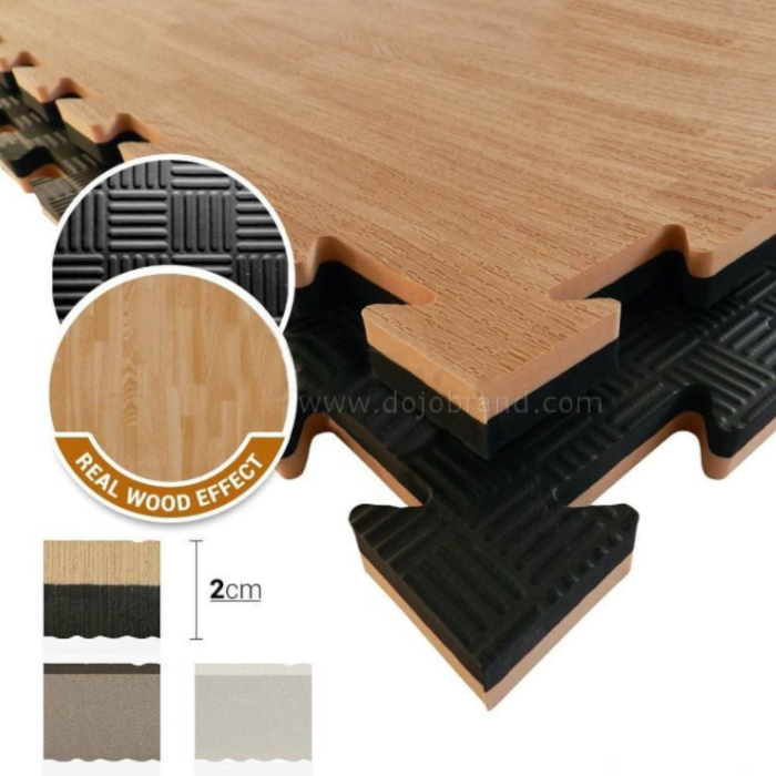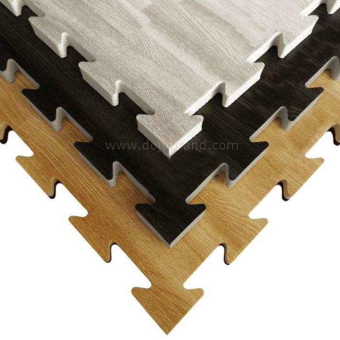 Made of a special expanded EVA compound (ethylene vinyl acetate), with high elasticity with single density closed cell, printed and cut by die-cutting in a special reversible interlocking system. The tatami is reversible, characterized by two sides: one with black 5-line embossing; the other covered with a thin layer of wood effect film that makes the product non-slip and gives it a warm and realistic look.